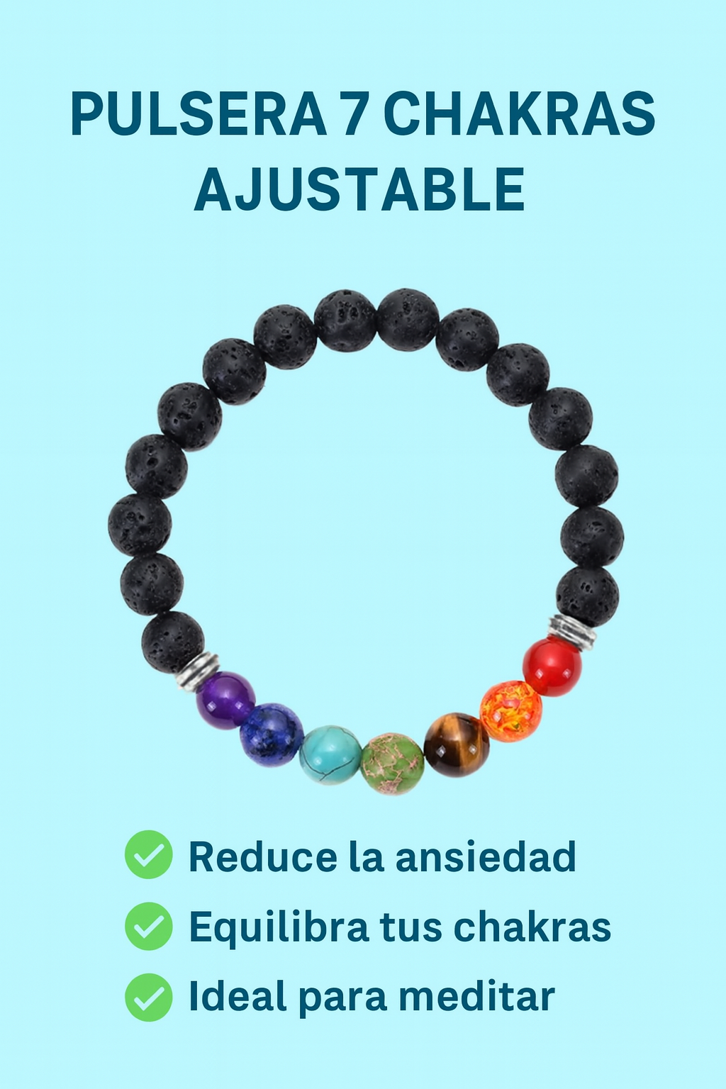 La Pulsera 7 Chakras está elaborada con piedra de lava natural y cuentas energéticas, pensadas para ayudarte a recuperar la calma, la confianza y la conexión contigo misma 🌿